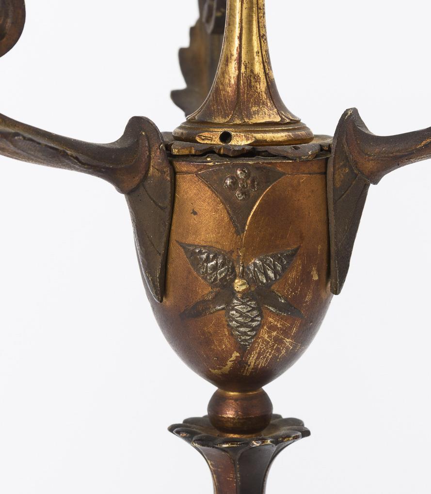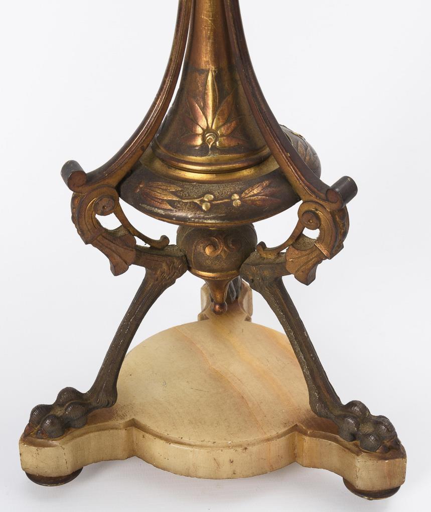 Alabaster-Plinthe, 3 Streben mit Tatzenbeinen an stark gewirteltem Schaft, 3 Arme an einer Vase sowie Zentraltülle mit Löschstopfen. Arme teils leicht verbogen, fehlende Zierappliken nicht auffallend, 1 Standfuß ersetzt, Alters-/Gebrauchsspuren.