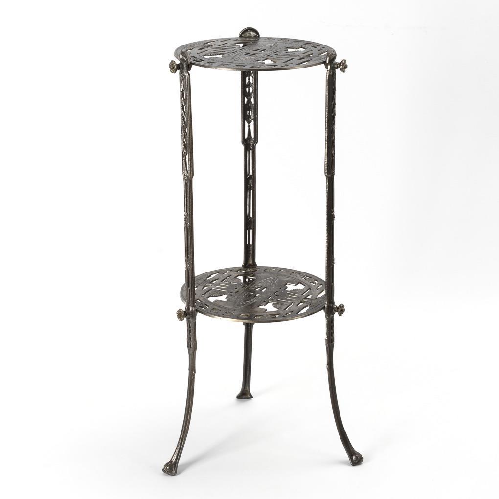 Blumensäule in stiltypischer Formensprache, auf 3 ornamentierten Beinen, verstrebt durch Sockelplatte. Leichte Alters-/Gebrauchsspuren, Korrosionsspuren.