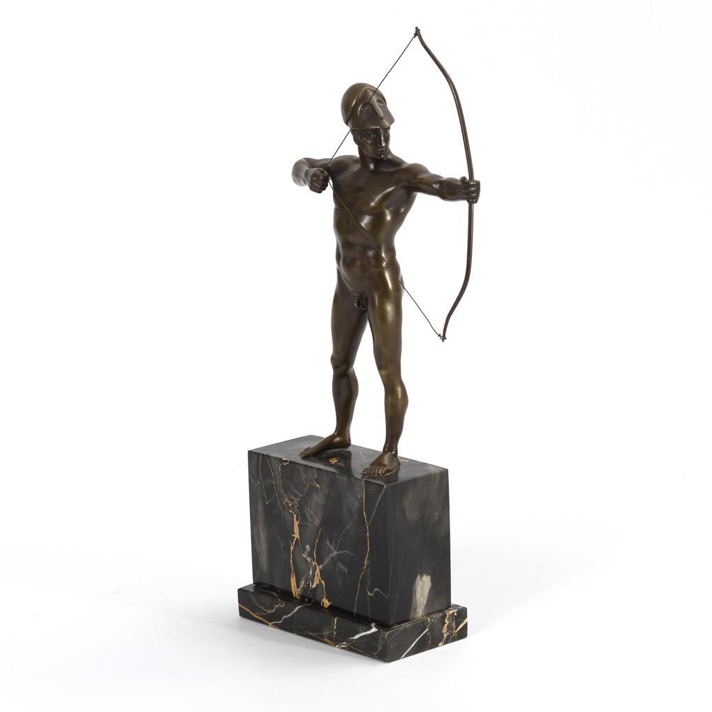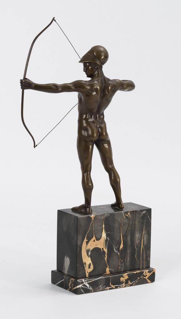 Ruhig stehender Akt eines jungen Mannes mit korinthischem Helm, der mit gespanntem Bogen das Ziel anvisiert.