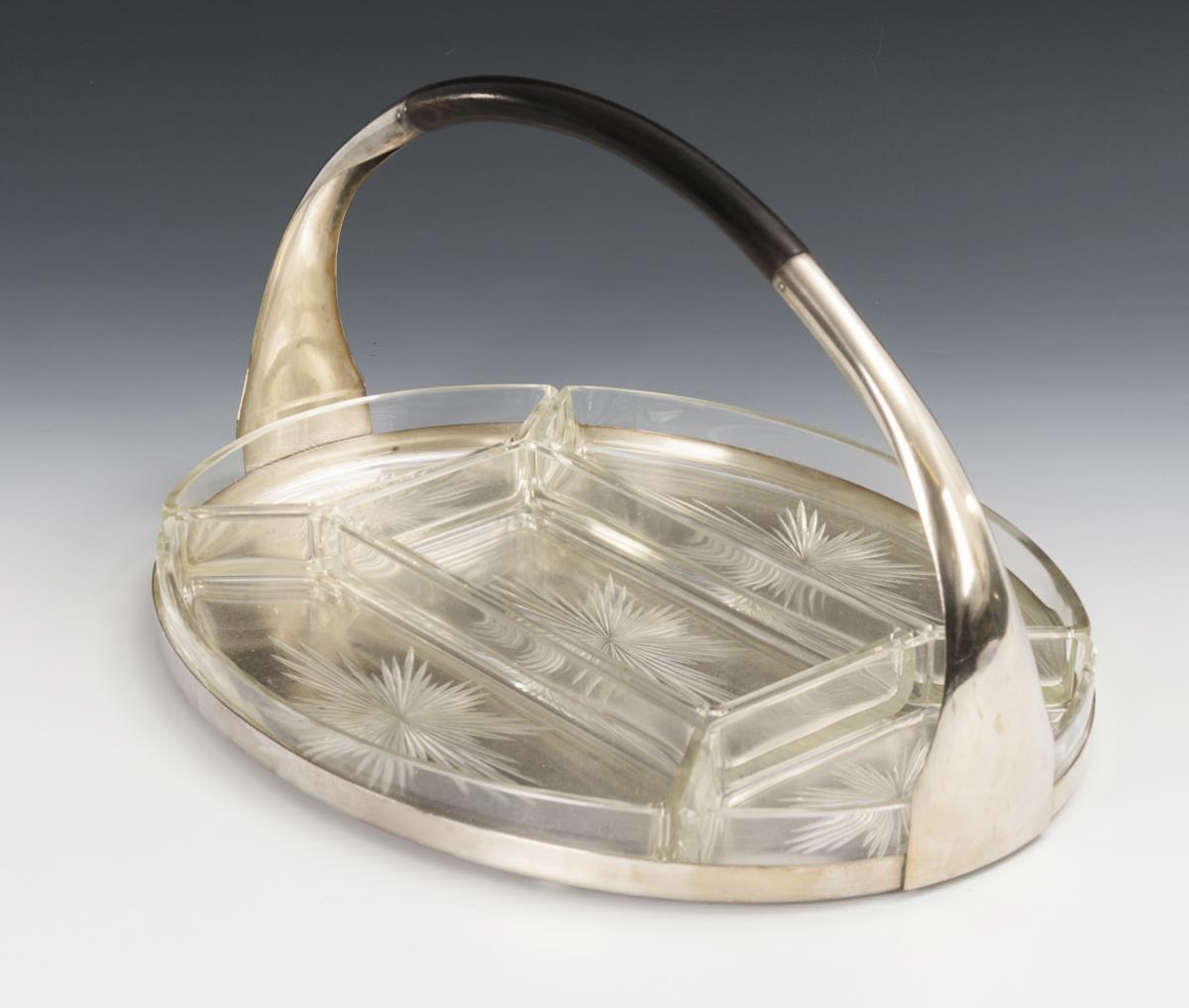 Metall versilbert, ebonisiertes Holz, Klarglas mit Schliff. 21 x 38 x 29 cm.