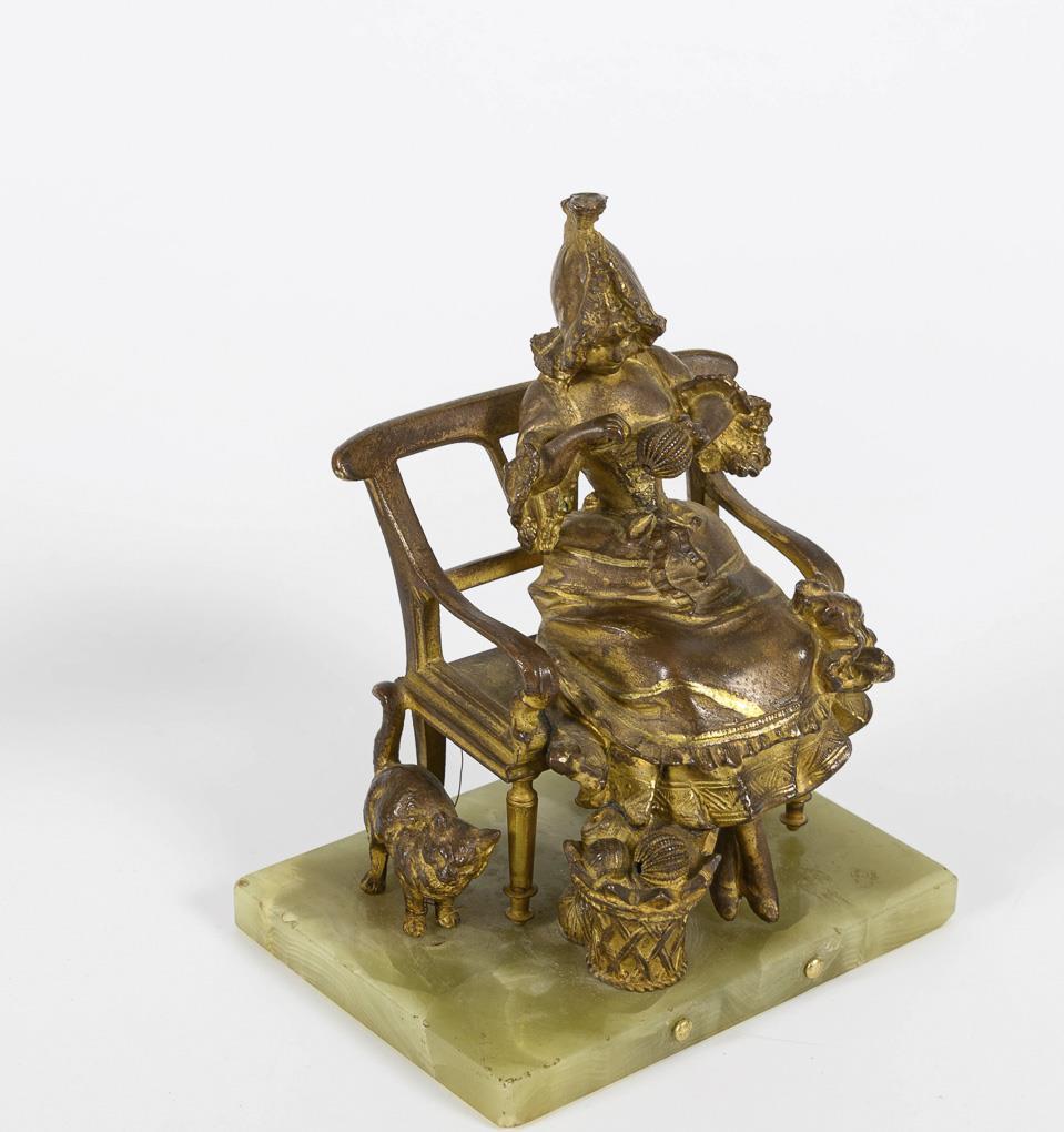 Sitzende junge Frau mit Wollknäueln sowie Katze. / Stehender Bursche mit Feder am Hut. Frauenfigur stark berieben und gedunkelt, minimale Chips am Marmor.