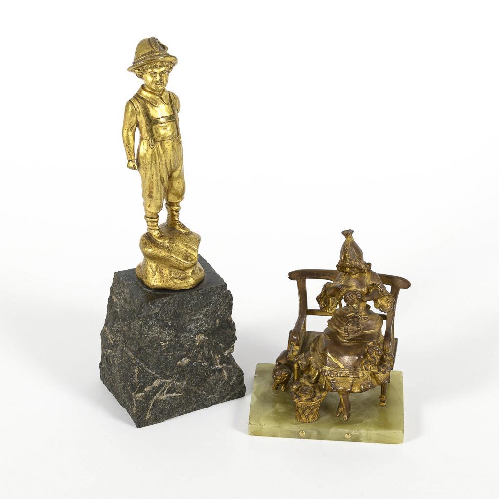 Goldfarbene Bronze, Stein-Sockel bzw. Onyxmarmor. H 11,5 / 12,5 bzw. 16 / 24 cm.