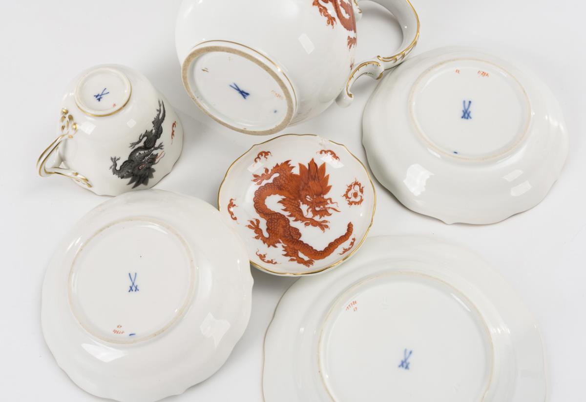 Form "Neuer Ausschnitt" mit korallenroter und grauer Drachenmalerei. Mokkakännchen (H 16 cm), 2 Mokkatassen, 2 Untertassen, 2 Gebäckteller, 1 Konfektschälchen und 1 Vierpassschale. Konfektschälchen mit Randbestoßung, 1 Tasse mit 2 minimalen Bestoßungen am Mündungsrand, minimale Bestoßung an 1 Untertassenrand.