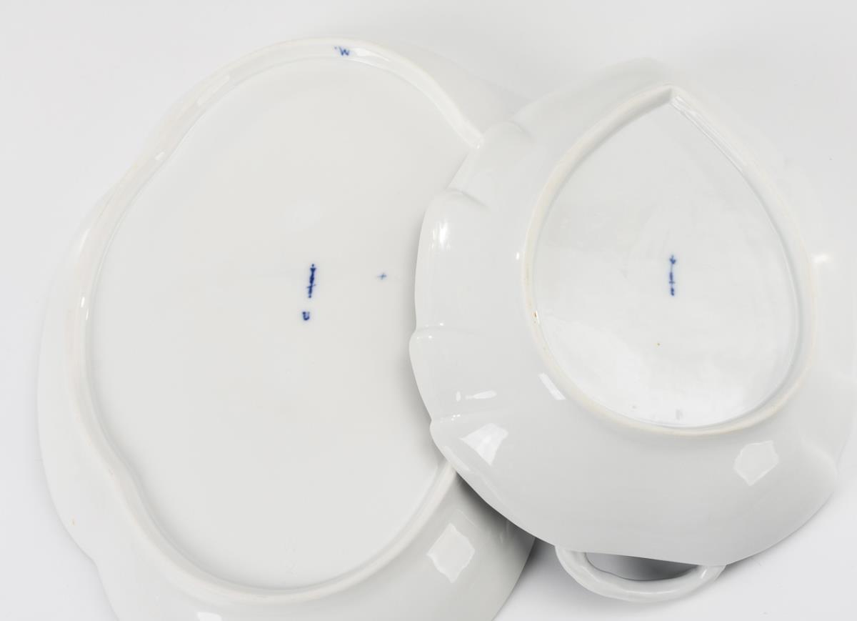 Unterglasurblaue Malerei. L Blattschale 19,5 cm, L Vierpassschale 26 cm.
