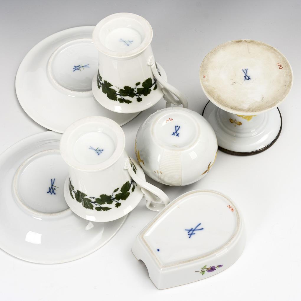 2 Weinlaubtassen, 1 Kerzenleuchter und 2 Ascher. Meissen.
