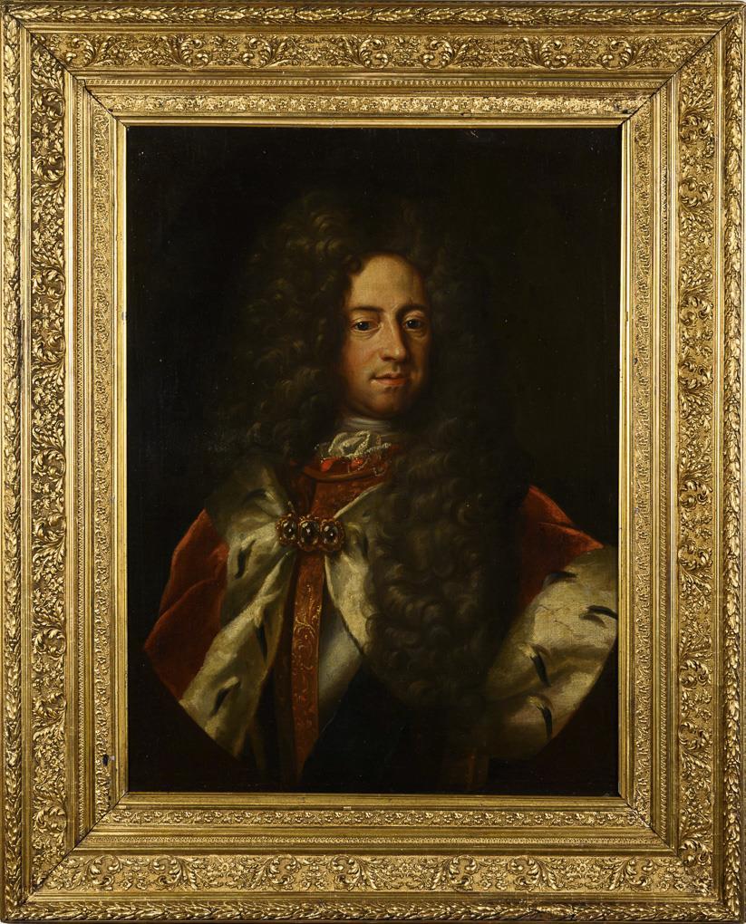 Porträt eines Herrschers mit Hermelinmantel und langer gelockter Allongeperücke vor dunklem Hintergrund. Leinwand doubliert.