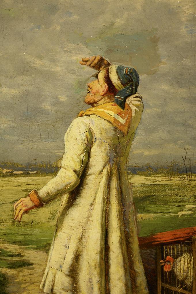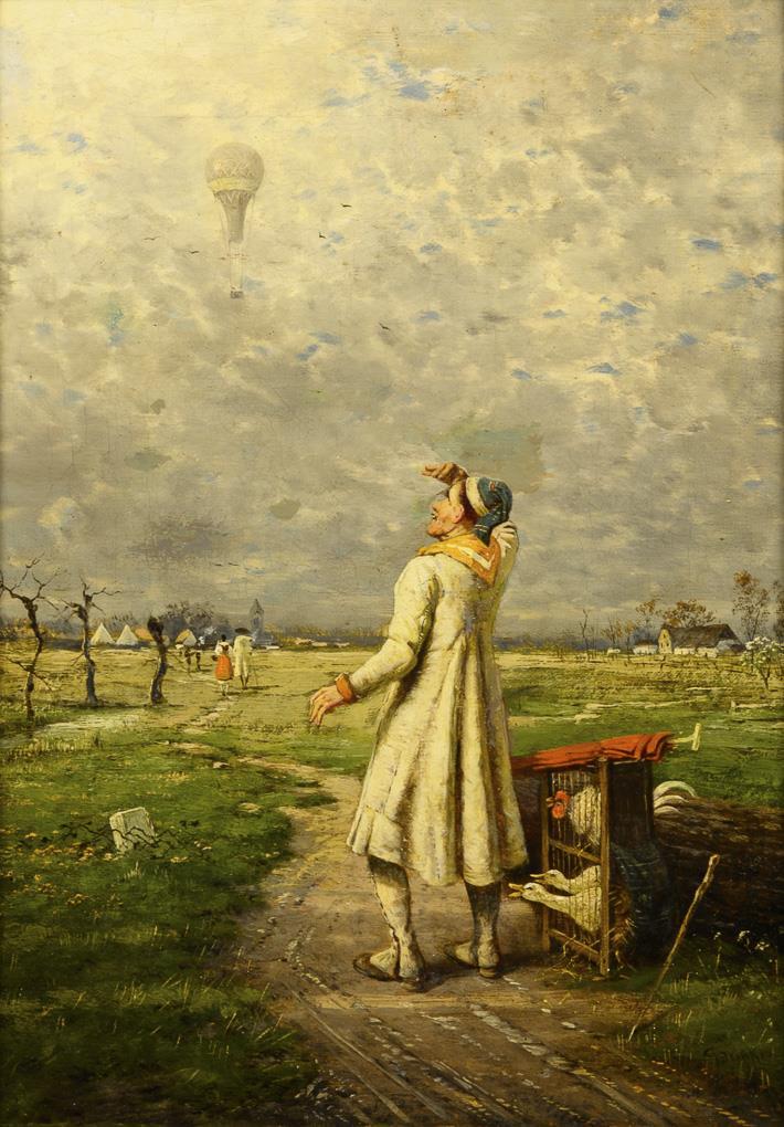 Junger Mann mit einem Käfig mit Enten und einem Hahn beim erstaunten Betrachten des fliegenden Ballons vor dem Wolkenhimmel. Eine kleine restaurierte Stelle.