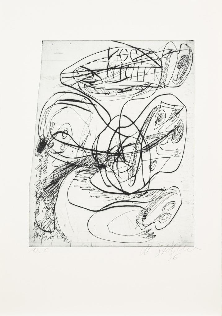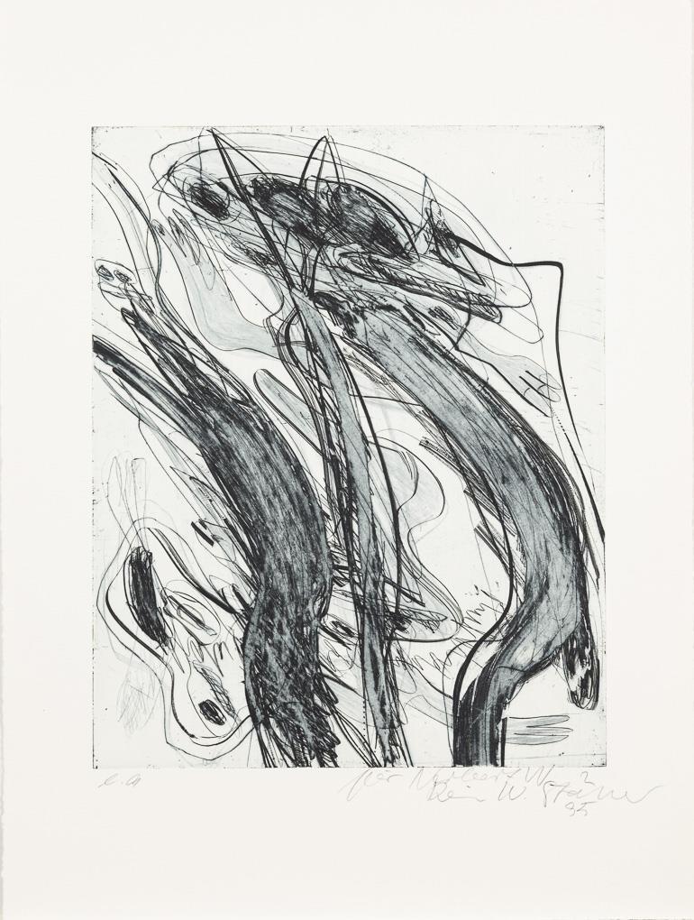Vollständiges Mappenwerk als Widmungsexemplar mit 12 Radierungen in originaler Kassette zu dem Gedicht "Noch nicht" von Gerard Manley Hopkins und 2 zusätzlichen Radierungen mit Widmung an den Kunstdrucker Norbert Weber, der das Werk umsetzte; dazu Beiblatt mit Impressum und Gedicht. 1 von 3 Widmungsexemplaren, 1996. Kassette mit grauem Leineneinband und montierter Radierung "Noch nicht". Kassette mit minimalen Altersspuren.