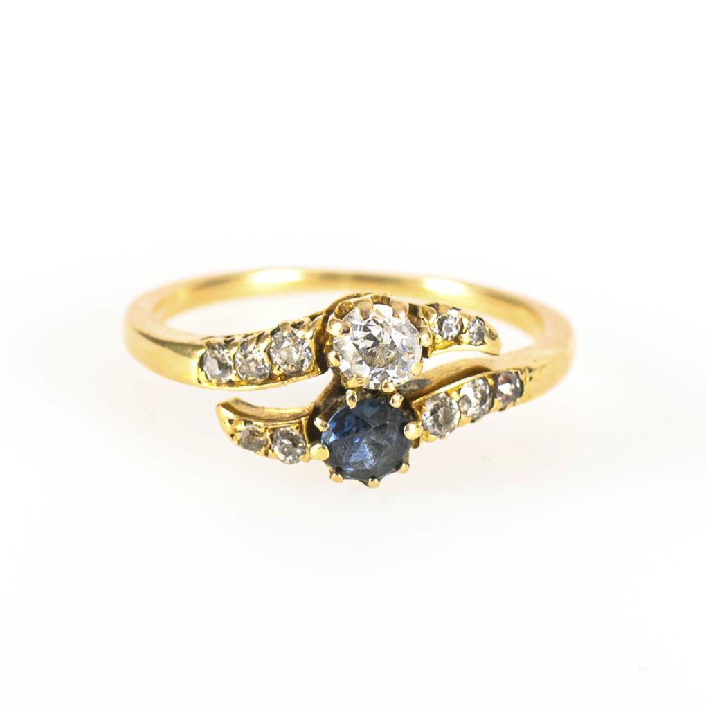 Ring mit Altschliff-Brillant, Saphir und Diamantrosen, um 1900.