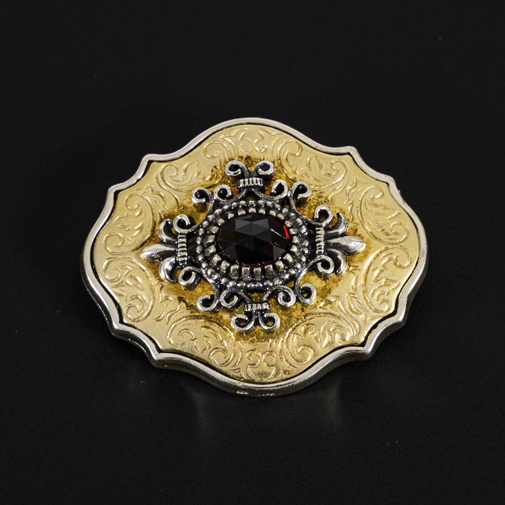Verzierte, teilvergoldete Ornamentbrosche mit Granat.