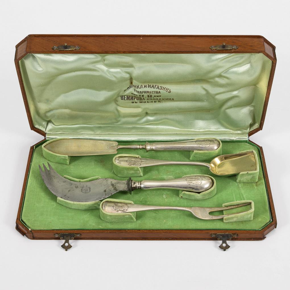 4-teiliges Silberbesteck mit verschlungener Monogrammgravur: Gebogenes Käsemesser, schmaler Heber, Fleischgabel und kleine Schaufel. Elegante Mahagoni-Schatulle mit Widmung in deutscher Sprache: "Zum freundlichen Andenken an die Kolleginnen. Moskau 23.Okt./5. Nov. 1904". Schatulle am Boden etwas defekt. Loch an der Rückseite des Messergriffes.