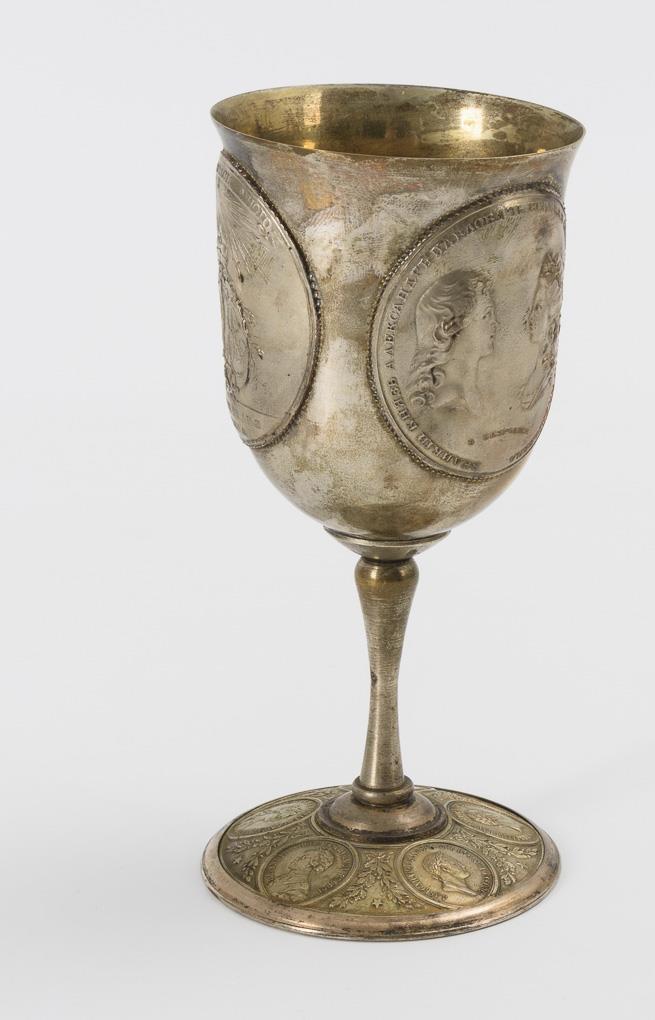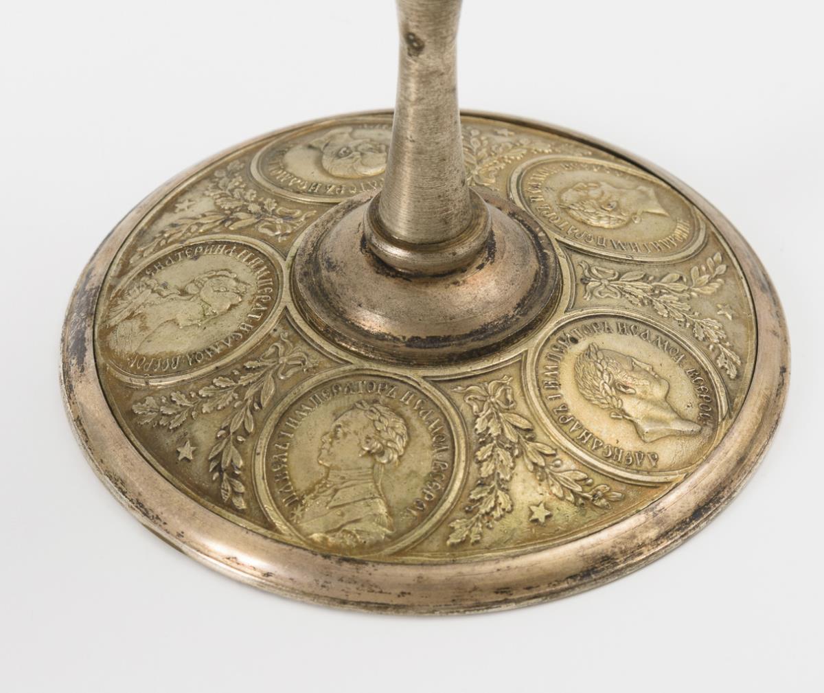 Rundfuß mit kyrillisch beschrifteten Bildnissen der Zarenfamilie (Zar Pawel). Kuppa mit 3 Medaillons: Großfürst Alexander Pawlowitsch und Großfürstin Aleksejewna / Doppeladler mit Umschrift "Mit uns ist Gott" / Monogrammkartuschen mit Hochzeitsdatum 1793. Teils deutliche Alters-/Gebrauchsspuren.