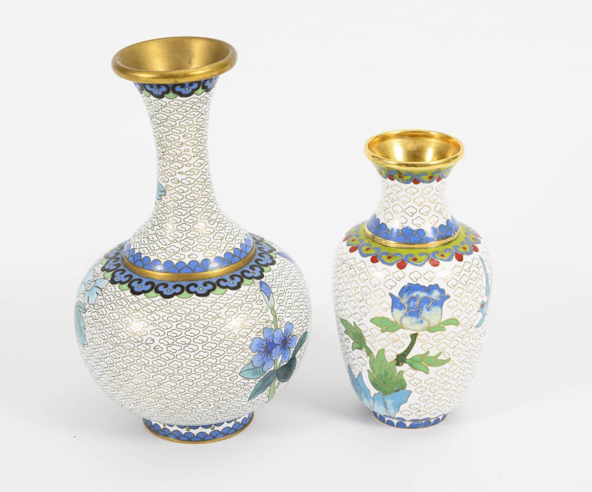 Balustervasen mit unterschiedlichen Motiven, vier davon mit Wolkenmuster im Fond. Blaue Vase mit gelben Drachen: zwei kleine Dellen.