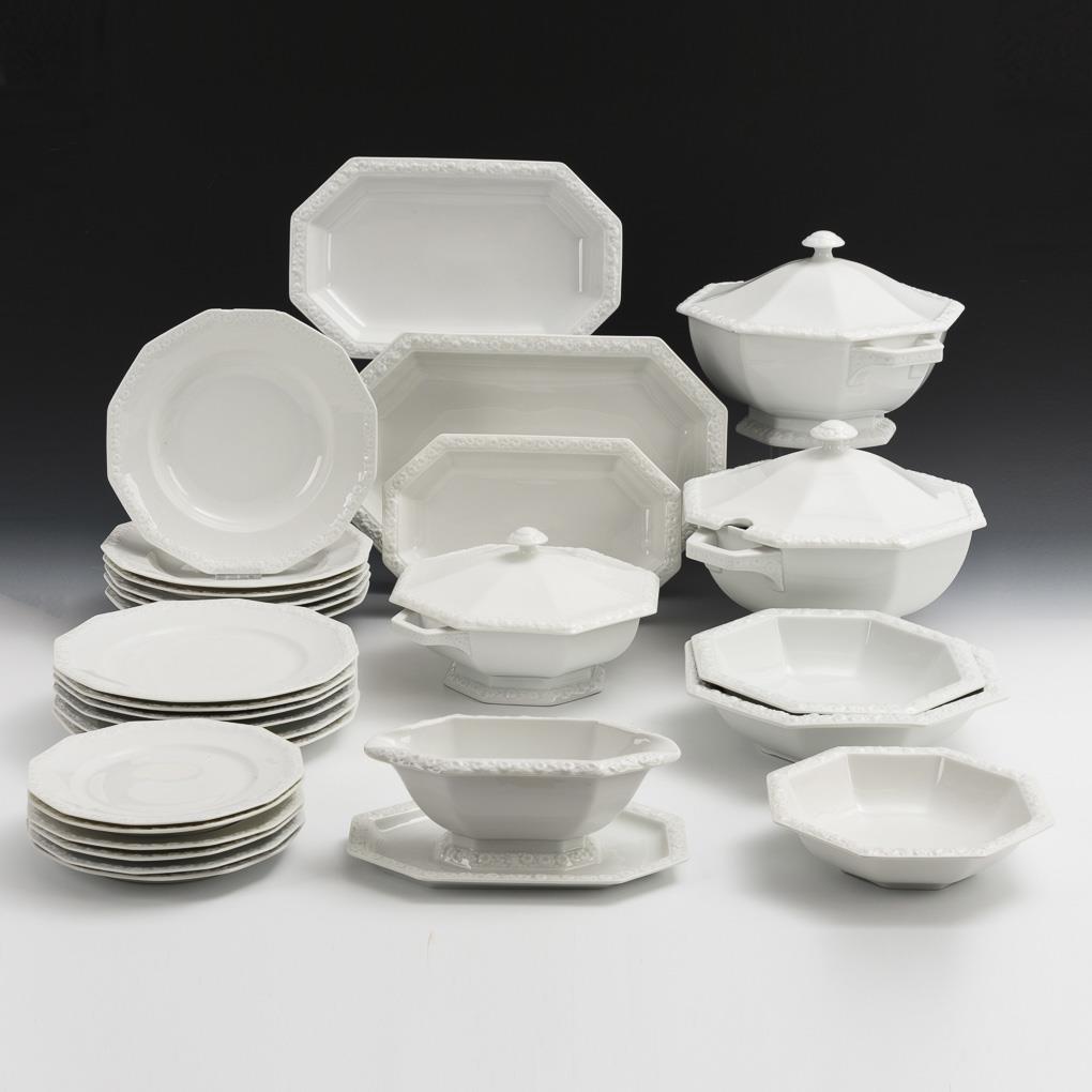 28 Teile. 6 Suppenteller, 6 Speiseteller, 6 Salatteller, 3 Schüsseln (Ø 21,5, 24,5 und 27,5 cm), 3 Platten (L 28, 32,5 und 37,5 cm), 2 Terrinen (H 21 cm), 1 Deckelschüssel (H 14 cm) und 1 Sauciere (L 25 cm). 1 Speiseteller mit Haarrissspinne, 1 Suppenteller mit 2 Bestoßungen.