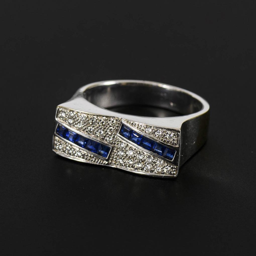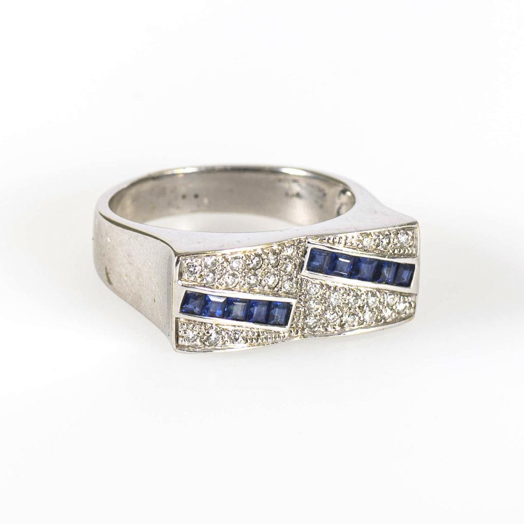 Weißgold 750 geprüft. Saphire total 0,80 ct. Brillanten total 0,24 ct. Ringgröße 60. 9,5 g.