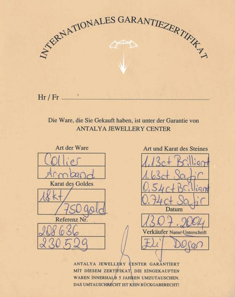 Schauteil besetzt mit 3 zargengefassten Brillanten, Saphir und 40 kleinen, eingelassenen Brillanten zwischen Stabgliederkette. Kastenschloss mit Achtersicherung.