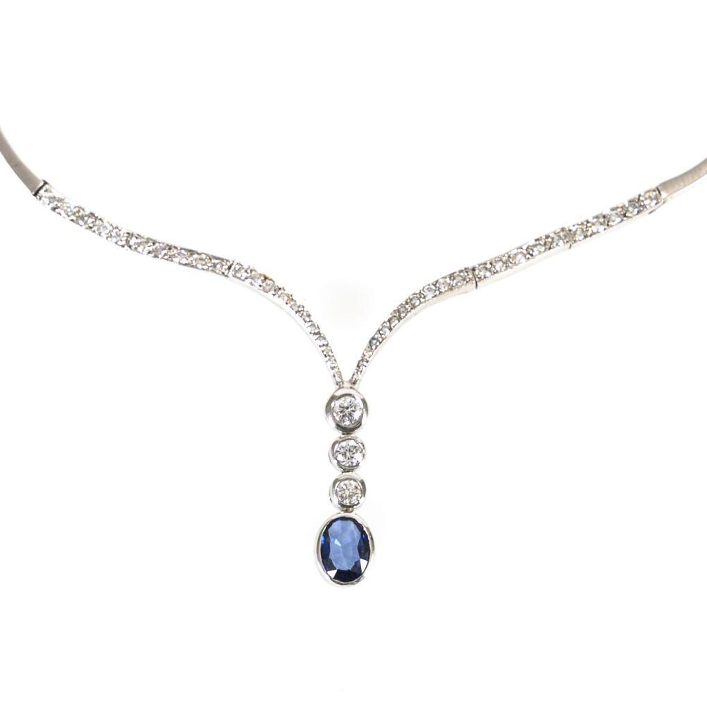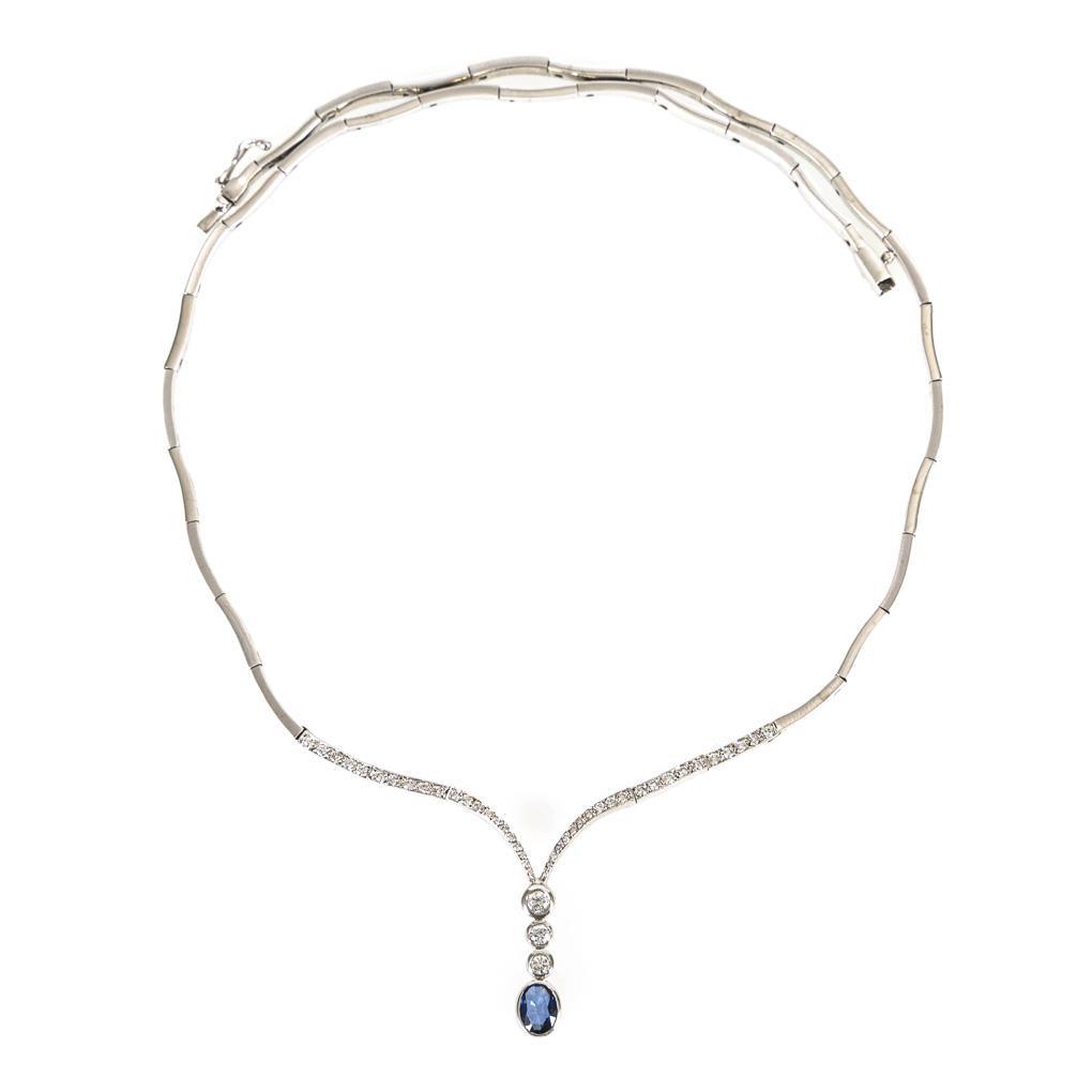 Weißgold 750 gestempelt. Saphir ca. 0,74 ct. Brillanten gesamt ca. 0,54 ct. Kette Ø 14 cm. 24,7 g.