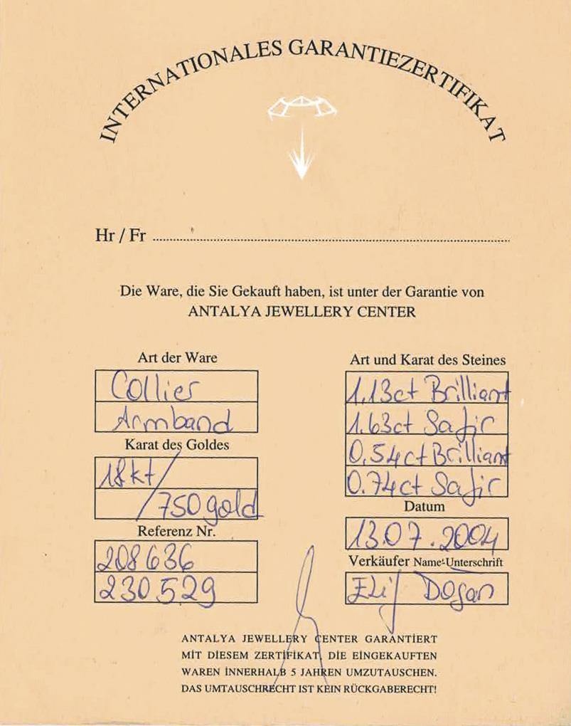 Weißgold 18 k gestempelt. Saphire gesamt ca. 1,63 ct. Brillanten gesamt ca. 1,13 ct. 19 x 0,5 cm. 13,5 g.
