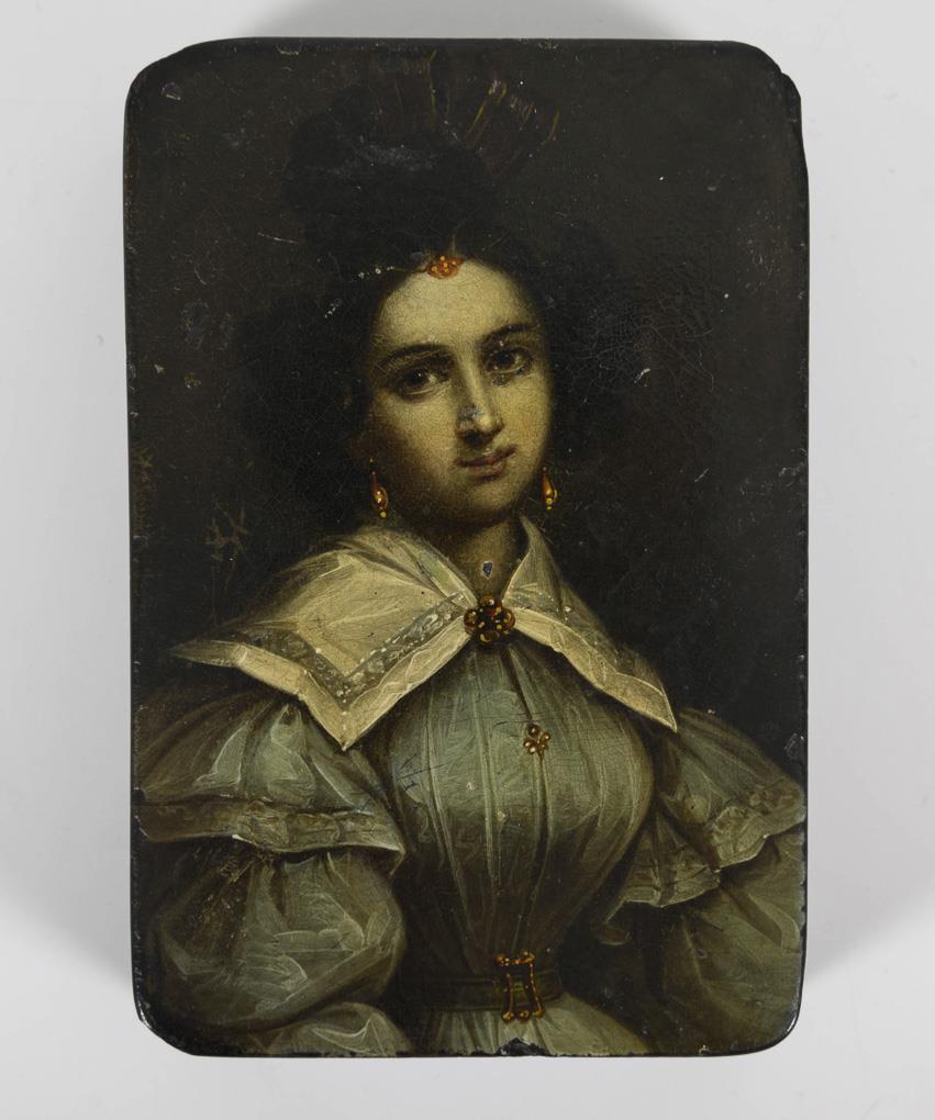 Quaderdose in Stein-Optik; auf dem Scharnierdeckel sehr fein gemaltes Halbporträt einer jungen Frau mit Goldschmuck. Kleinere Bestoßungen zumeist retuschiert.