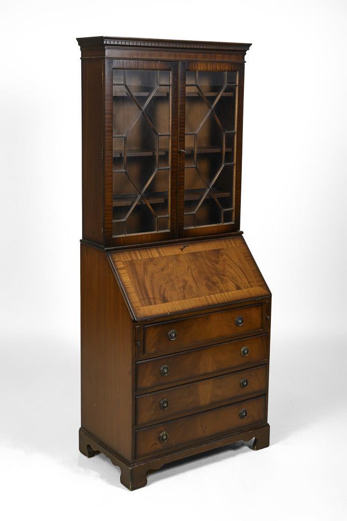 Schmaler Vitrinenaufsatzsekretär mit 4-schübigem Kommodenunterteil, mittlerem Sekretärteil mit schräger Klappe und seitlich herausziehbaren Stützen und 2-türigem Vitrinenaufsatz mit dekorativ versprosstem Glas; Sekretärteil 2 kleinen Schüben und etlichen offenen Ablagen, Schreibplatte mit grünem Lederbezug, Aufsatz innen mit 3 Einlegeböden. Leichte Alters-/Gebrauchsspuren, Furnier etwas trockenrissig.