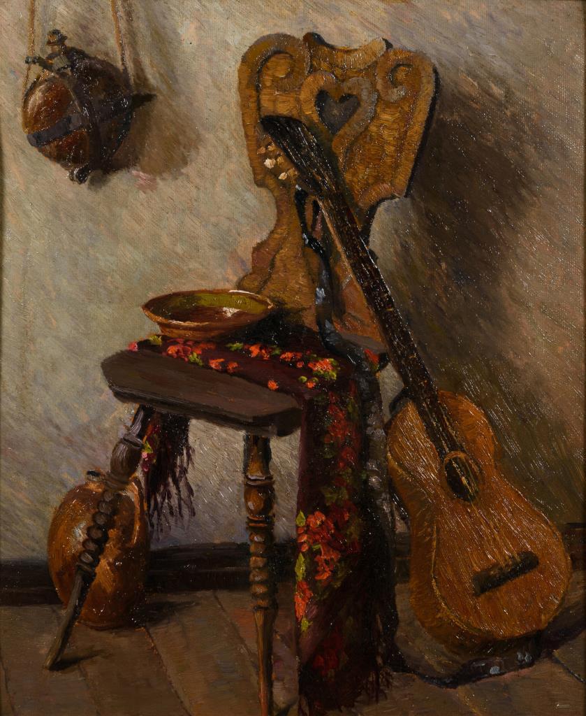Bauernstuhl mit floral gemustertem Tuch, Schale und Gitarre.
