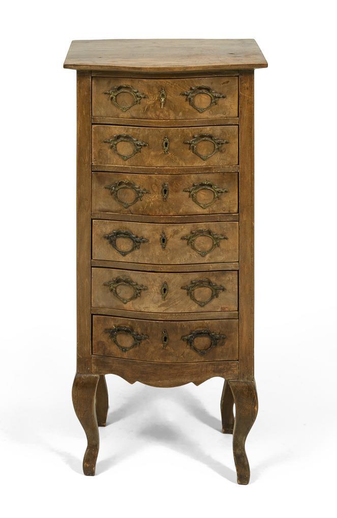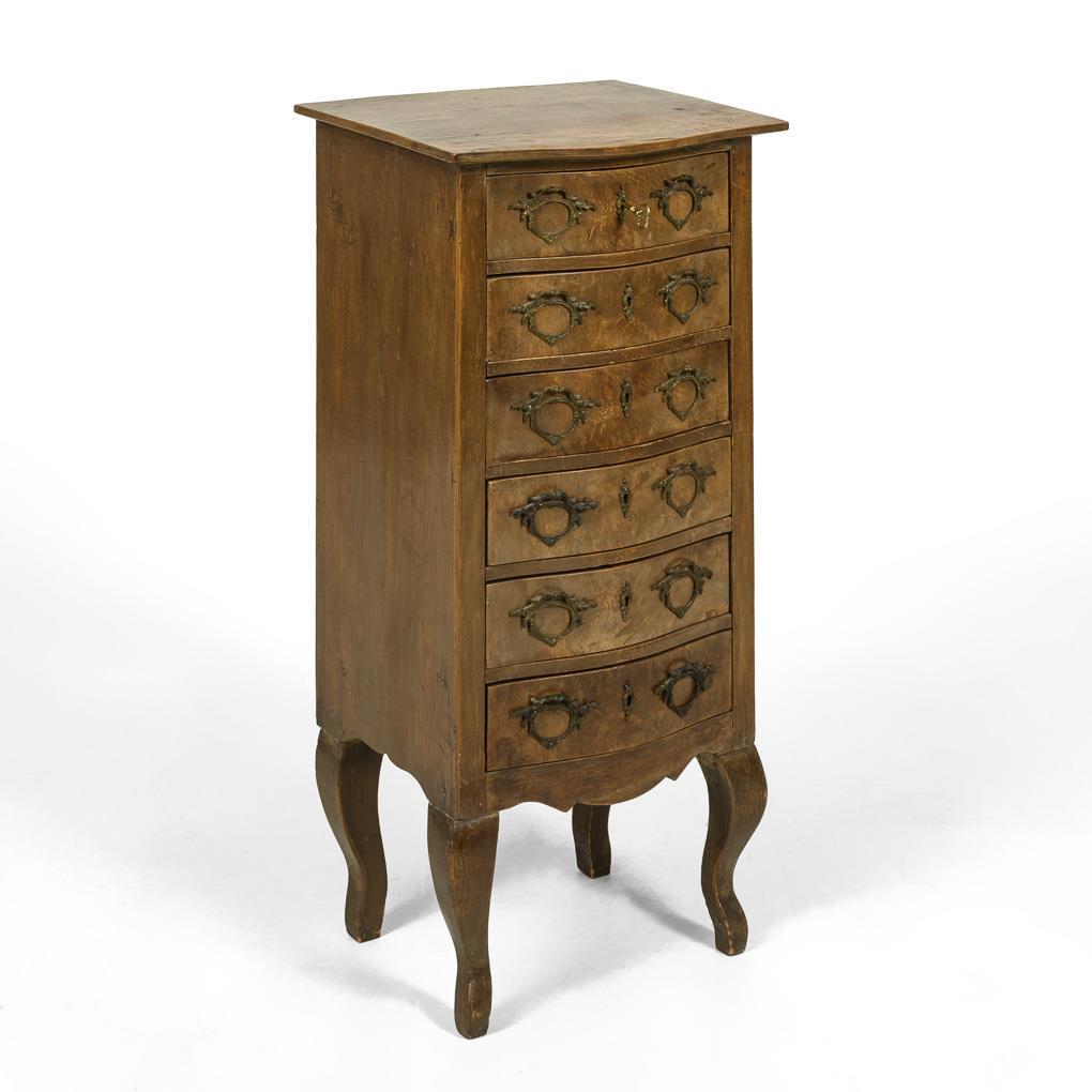 Zierliche 6-schübige Pfeilerkommode auf leicht ausgestellten Beinen, dekoriert mit stiltypisch geschwungenen Beschlägen. Alters-/Gebrauchsspuren.