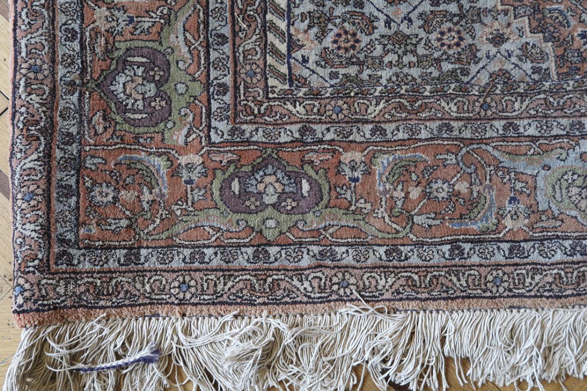 Hexagonales Rautenmedaillon und korrespondierende Eckzwickel auf einem im Endlosrapport gemusterten Mittelfeld mit Herati-Dekor. Mehrreihige Samowar-Bordüre. Leichte Alters- und Gebrauchsspuren, teils verblichenes Kolorit.