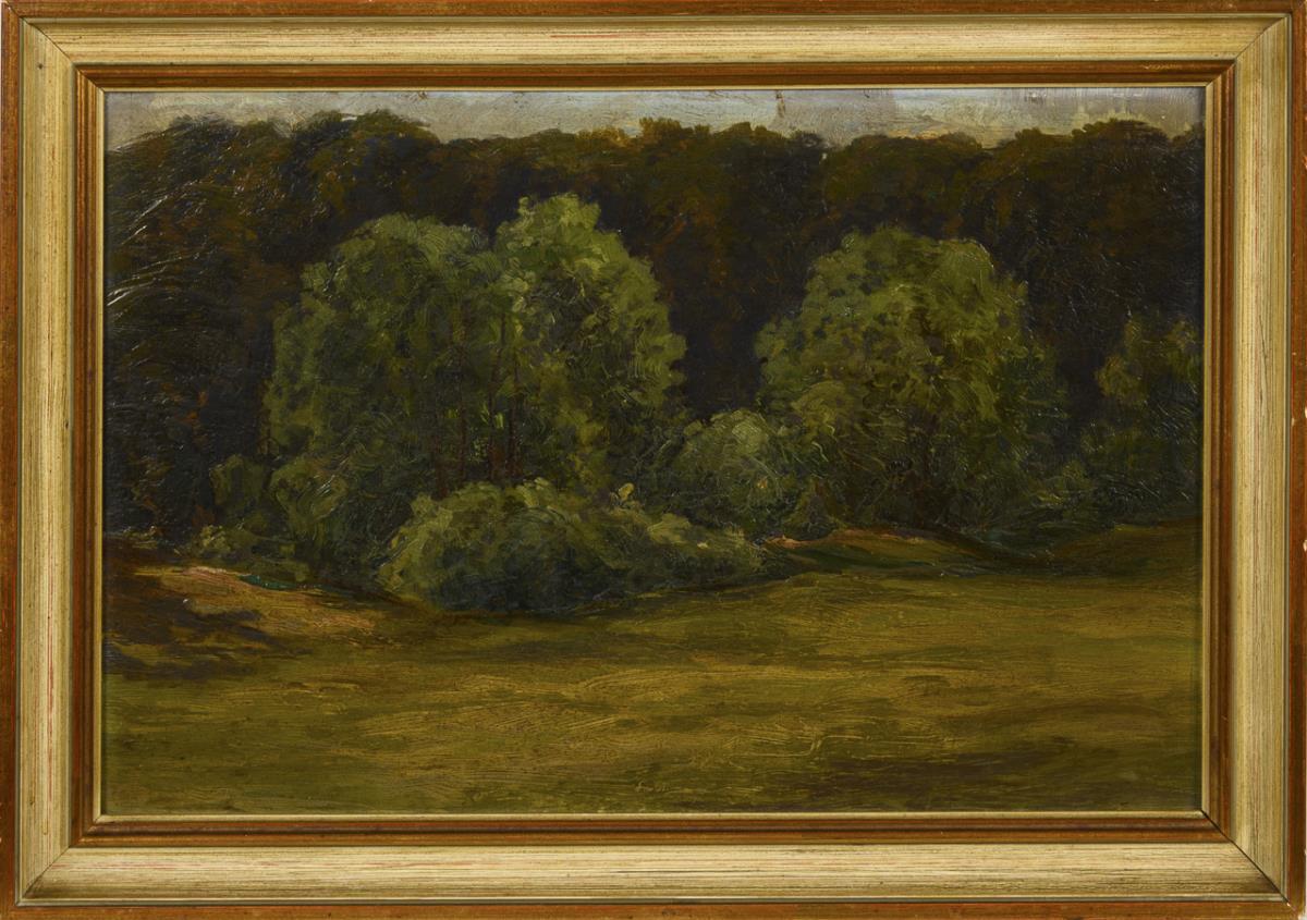 Wiese vor dichtem Laubwald unter blauem Himmel. Leichte Altersspuren.