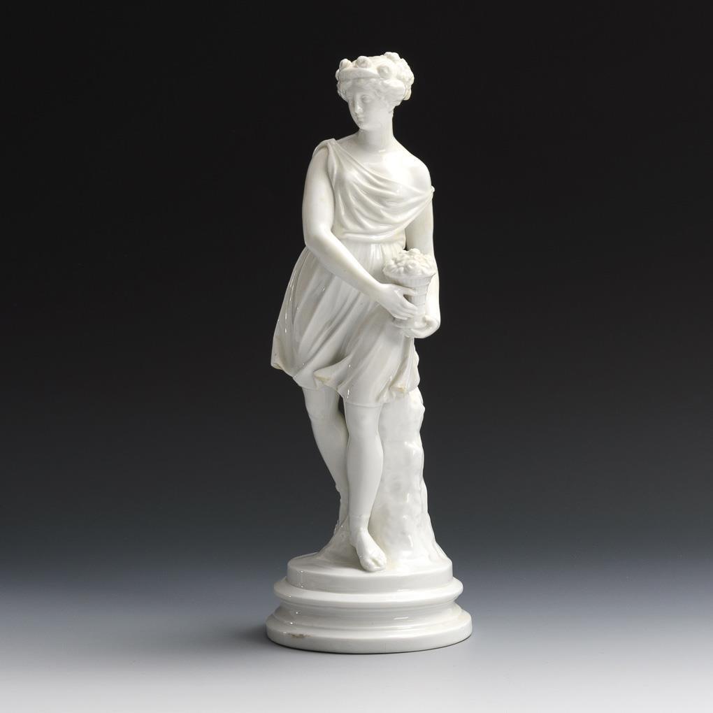 Auf einem Rundsockel stehende, antikisch gekleidete Frau mit Blumenkorb und Blumenschmuck im Haar.