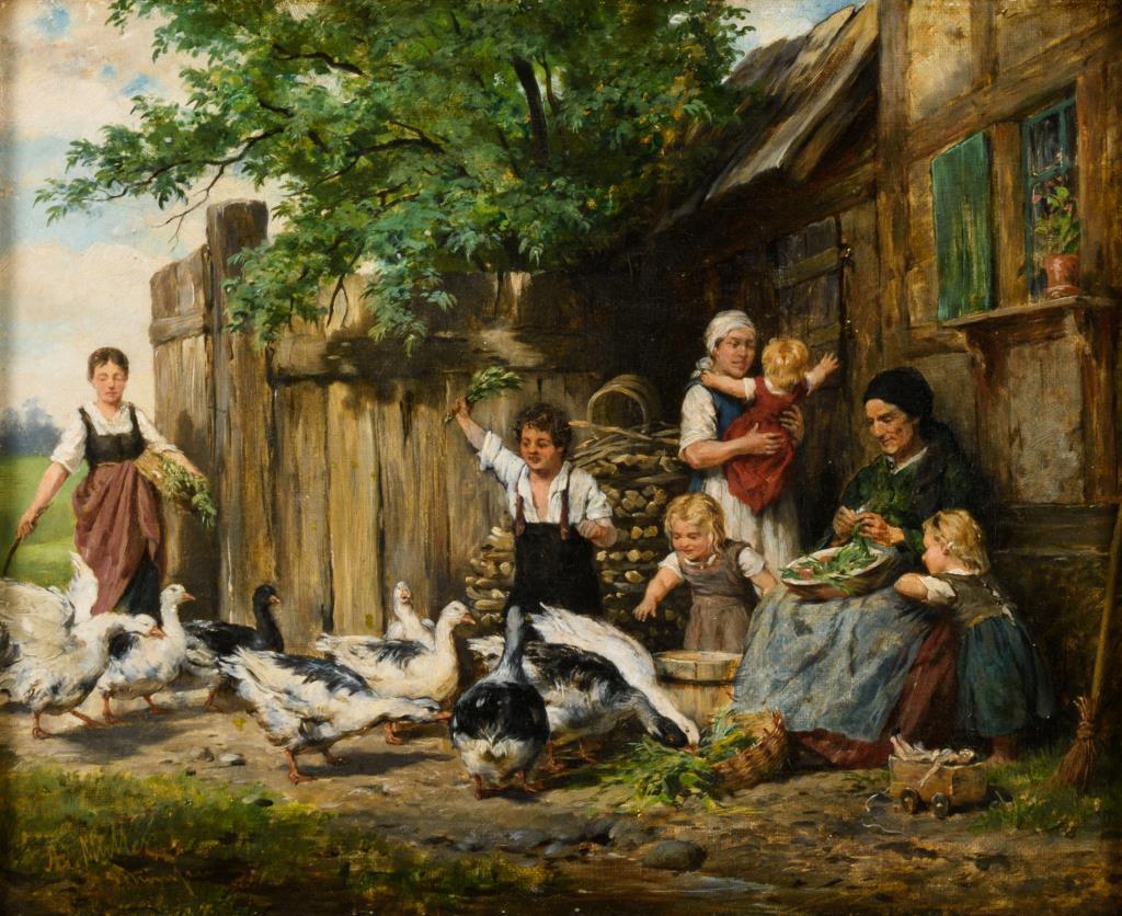 Die Familie vor dem Haus mit den Gänsen bei der Arbeit und im Spiel.