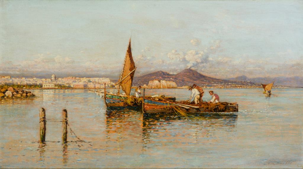 Die Fischer in den Booten auf dem ruhigen Wasser nahe dem Ufer mit der Stadt und dem rauchenden Vulkan am Horizont.