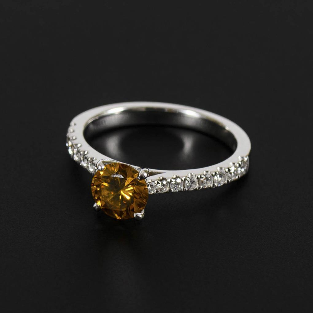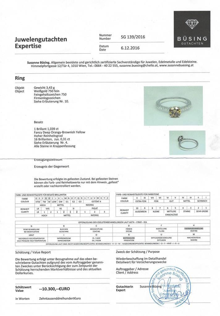 Weißgold 750 gestempelt. Punze: RT. Brillant 1,039 ct/Fancy Deep Orangy-Brownish Yellow/Hoher Reinheitsgrad/16 Brillanten total 0,31 ct. 3,5 g.
