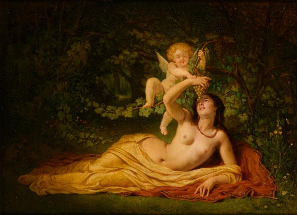 Liegende junge Frau im idyllischen Licht mit einem Putto, welcher ihr ein Rebe mit Trauben reicht. Eine kleine restaurierte Stelle mit Hinterklebung.