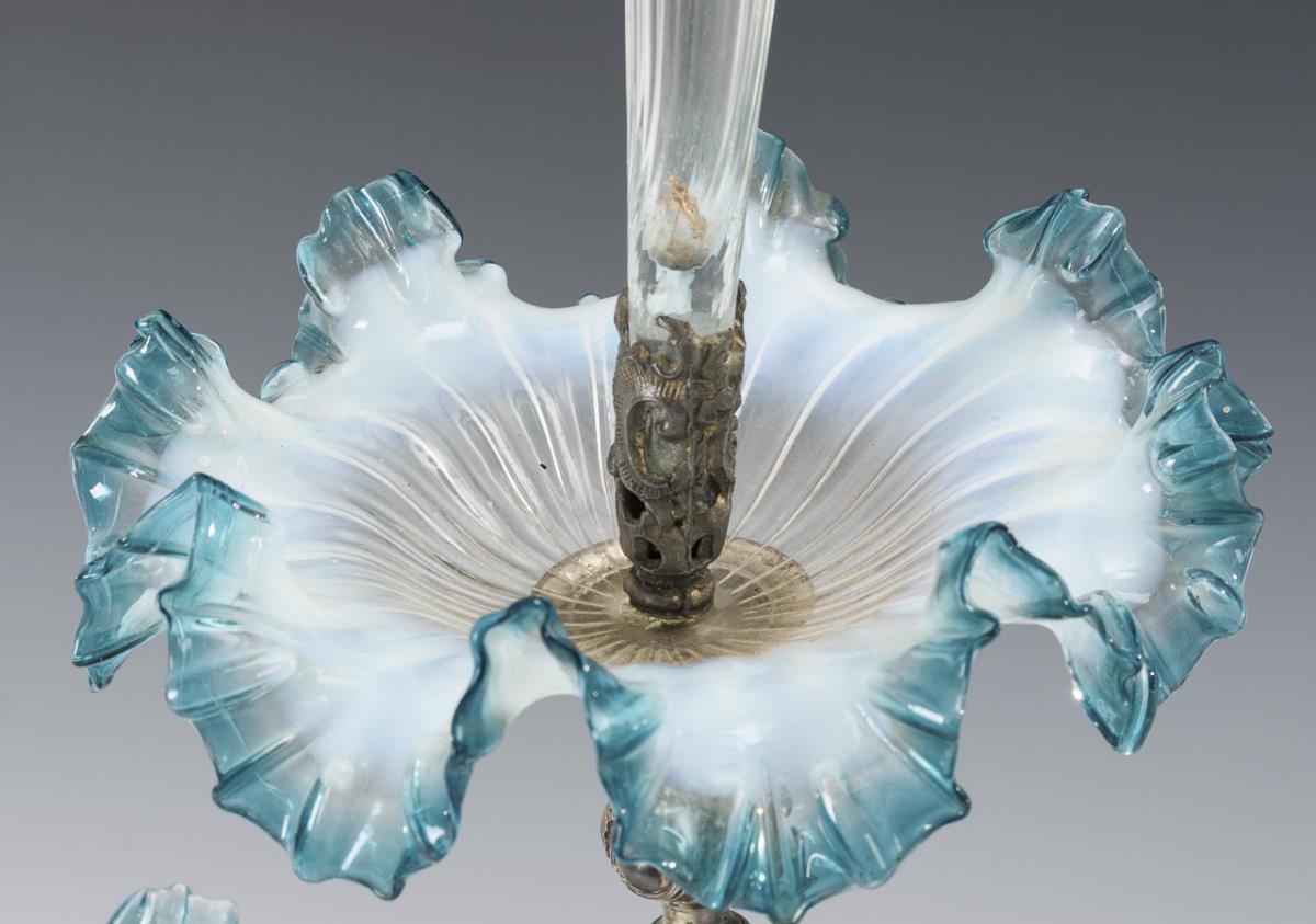 Im Stil des Barock prächtig mit Rocaillen reliefierter Fuß; darüber Strebewerk mit 3 gestuft angebrachten Glasschalen sowie bekrönender -Flöte. Schrägstand der Bekrönung, 1 minimaler Chip am Glasrand, Versilberung teils berieben.