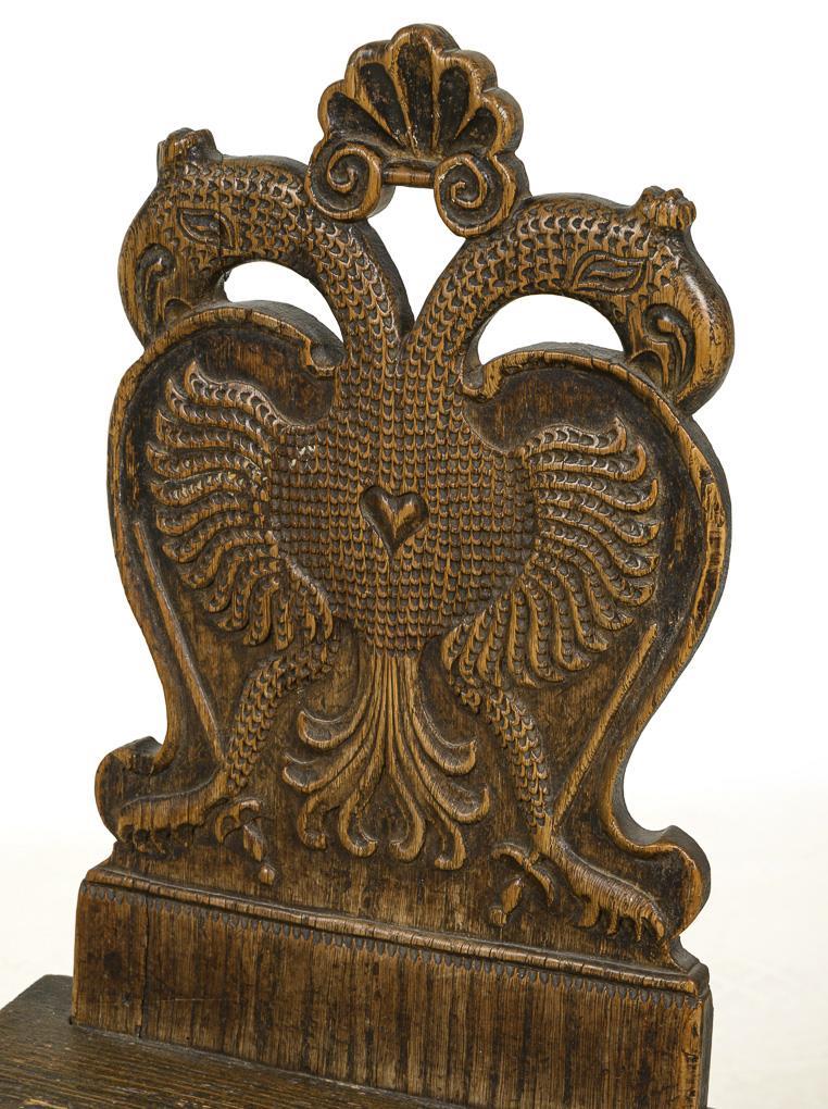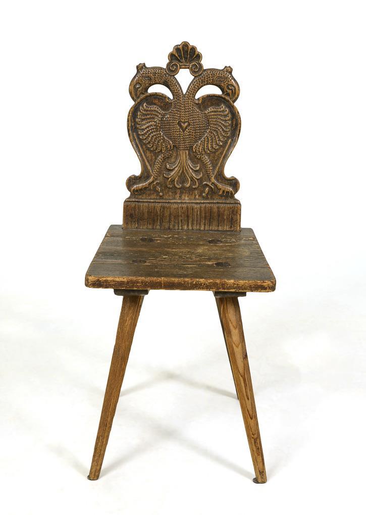 Bauernstuhl mit üppig beschnitzter Rückenlehne in Form eines Doppeladlers, auf 4 ausgestellten, geschnitzten Beinen. Alters-/Gebrauchsspuren, alt restauriert.