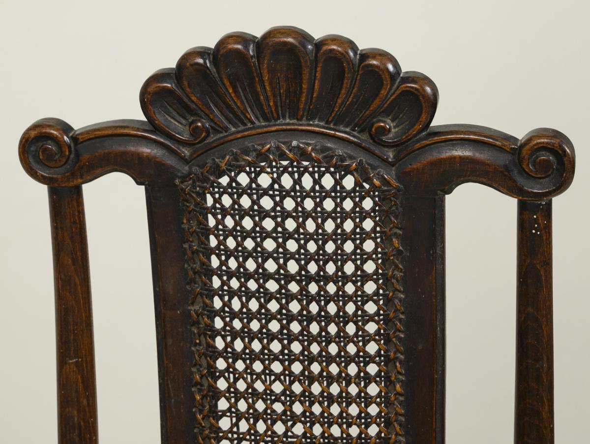 2 ähnliche Lehnstühle in stiltypischer Formgebung mit Sitzfläche und Rückenlehne aus Korbgeflecht. Starker inaktiver Anobienbefall, Alters-/Gebrauchsspuren.