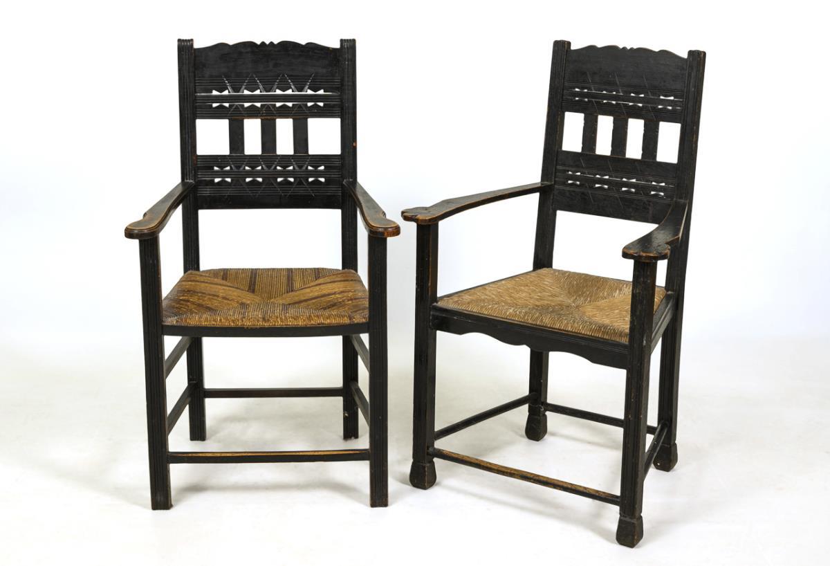 2 ähnliche Armlehnstühle mit trapezförmiger Sitzfläche aus Binsengeflecht und reliefverzierter Rückenlehne mit geometrischen Mustern. Alters-/Gebrauchsspuren, 1 Stuhl wackelig.