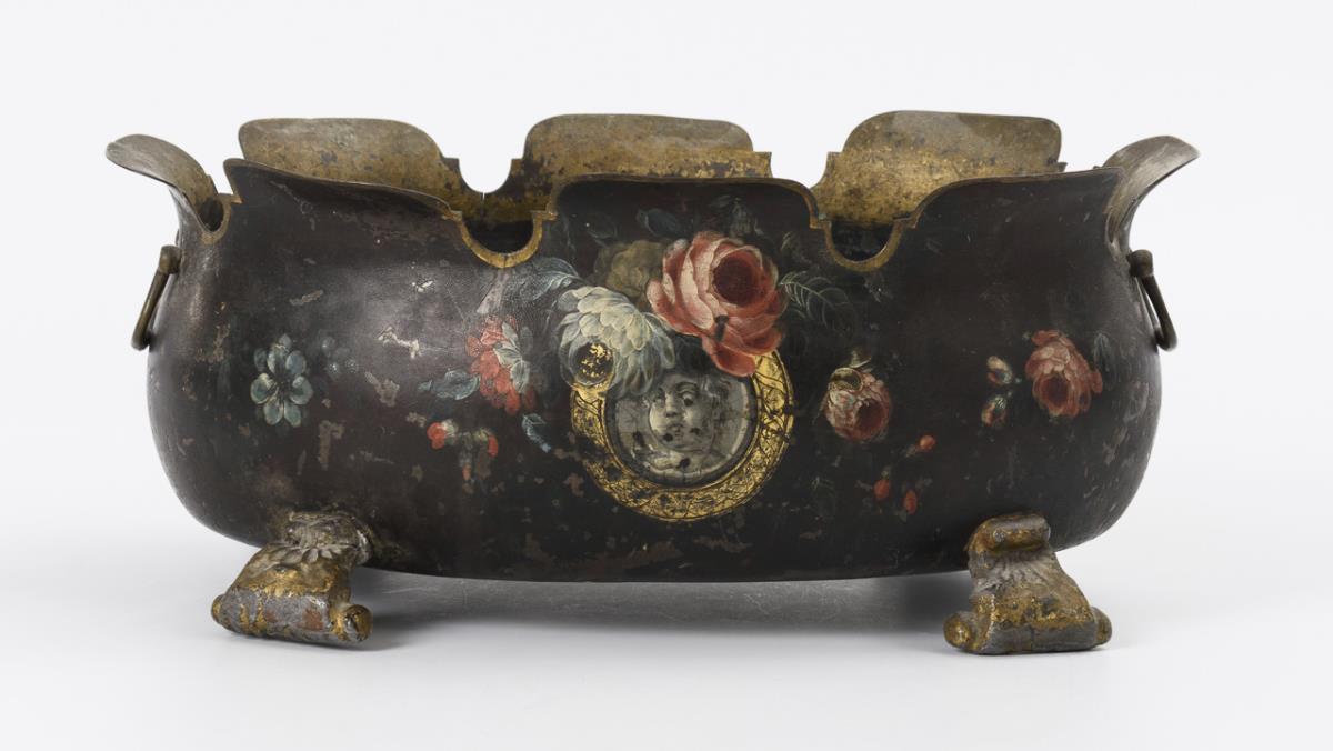 Auch als Jardiniere verwendbarer ovaler Glaskühler mit Volutenfüßen und passigem Rand. Auf dunkler Lackierung an den Längsseiten je farbprächtige Blüten (zumeist Rosen) sowie je ein Tondo mit Puttenkopf. Lötreparaturen, zumindest Füße ergänzt, Alters-/Gebrauchsspuren.