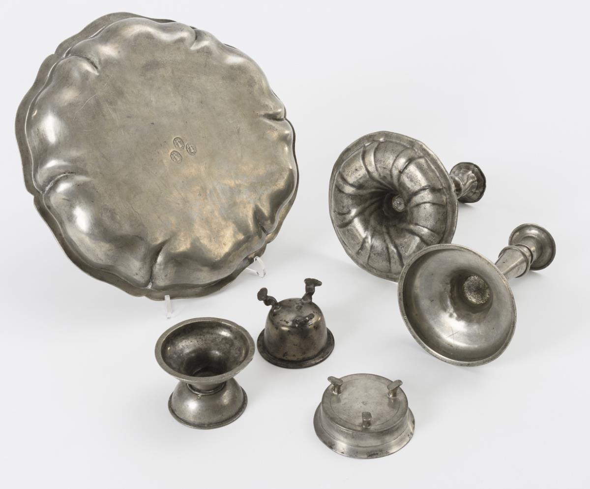 2 Kerzenleuchter, darunter 1 barocker in Silberart bzw. mit Gravur "JTG 1820". 3 Gewürzschälchen, darunter 1 barocke Saliere mit geschwungenen Füßen sowie 1x mit Gravur "CR 1834". "Leclerc Metz" gemarkte Kanne mit Drachenköpfen am Henkel. Godronierte Schale. Teils stärkere Alters-/Gebrauchsspuren.