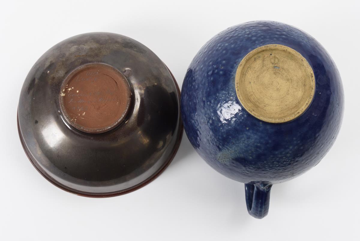 Kobaltblaue Kugelbauchkanne mit kurzer, gerader Schneppe, Ohrenhenkel und glockenförmigem Deckelchen, H 23 cm. Braune Rundschale, innen weiß glasiert, H 9 cm, Ø 19 cm. An Schneppe, Lippe und Deckel restauriert.