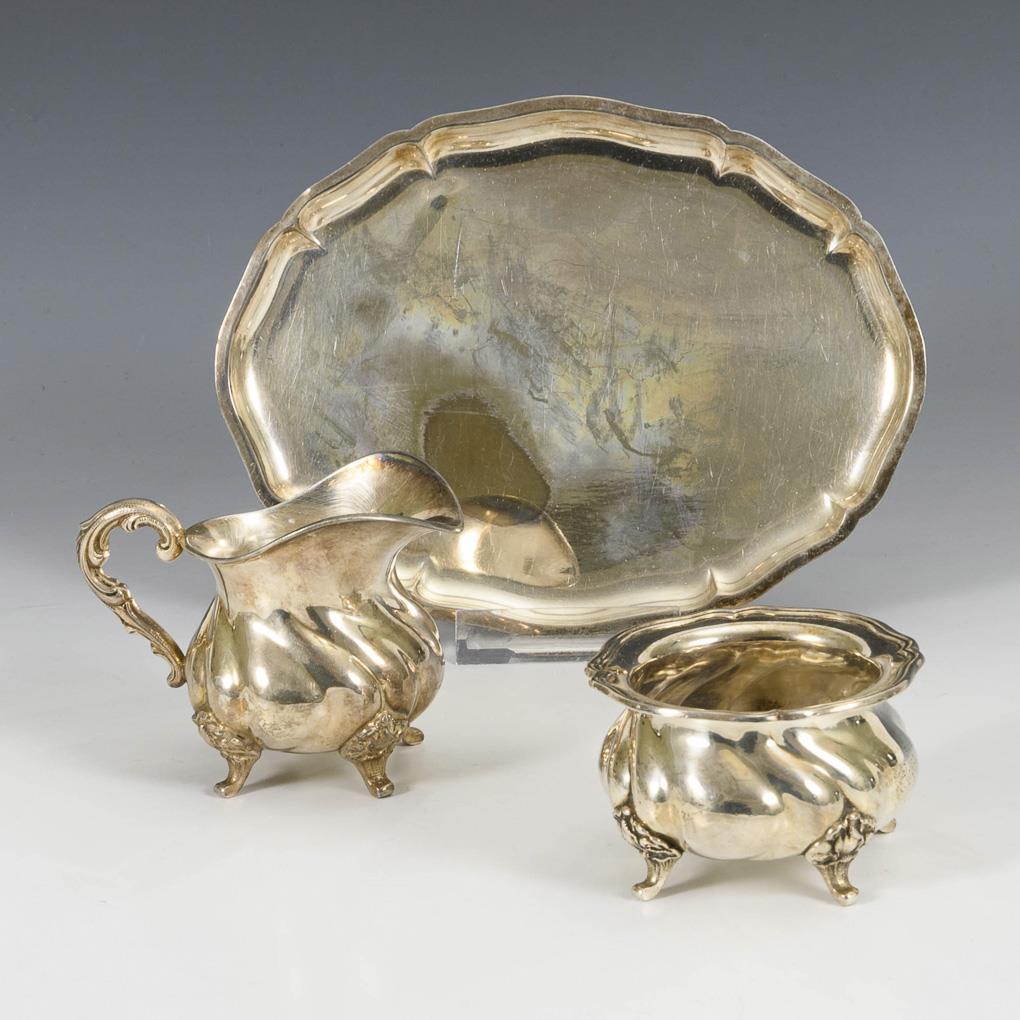 Godroniertes Kännchen und passende Zuckerschale, auf passend ergänztem Ovaltablett (L 19 cm). Leichte Gebrauchsspuren.