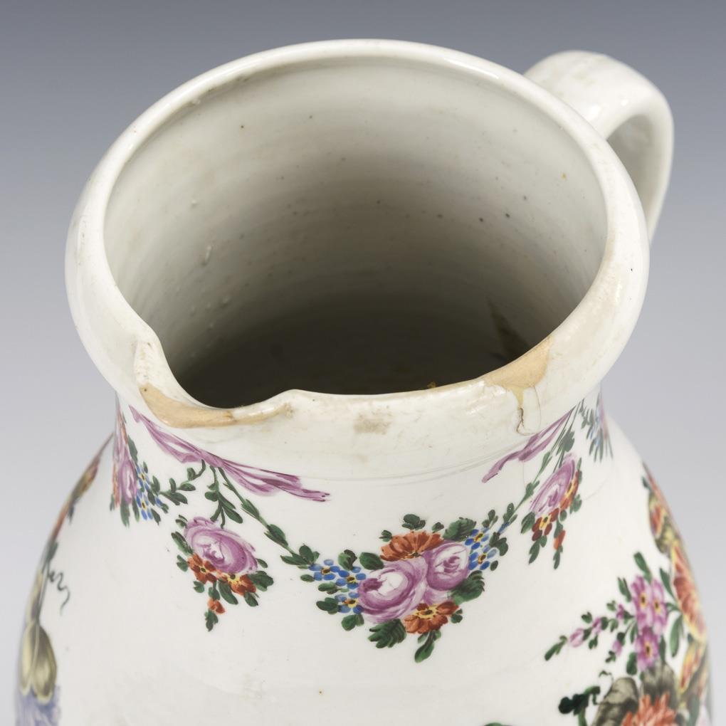 Birnkrug mit Bandhenkel. Schauseitig ein von zwei üppigen Blumenbuketts flankierter Rosenkranz mit dem Monogramm "F.H.", Blütengirlanden am Rand. Haarriss am Rand, Restaurierung am Rand und an der Schneppe.
