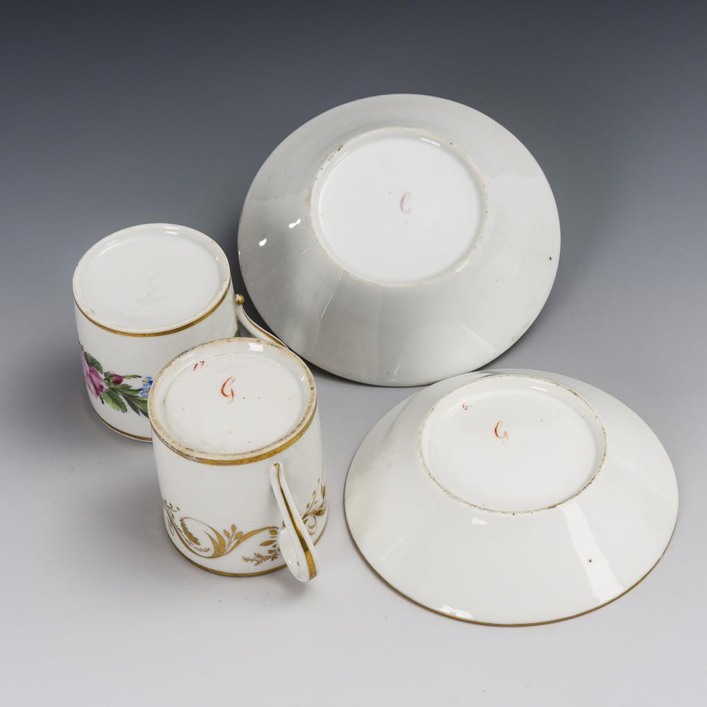 1x polychrom bemalt und goldstaffiert, 1x goldstaffiert. H Tassen ca. 6 cm, Ø originale Untertassen 12,5 und 13 cm.