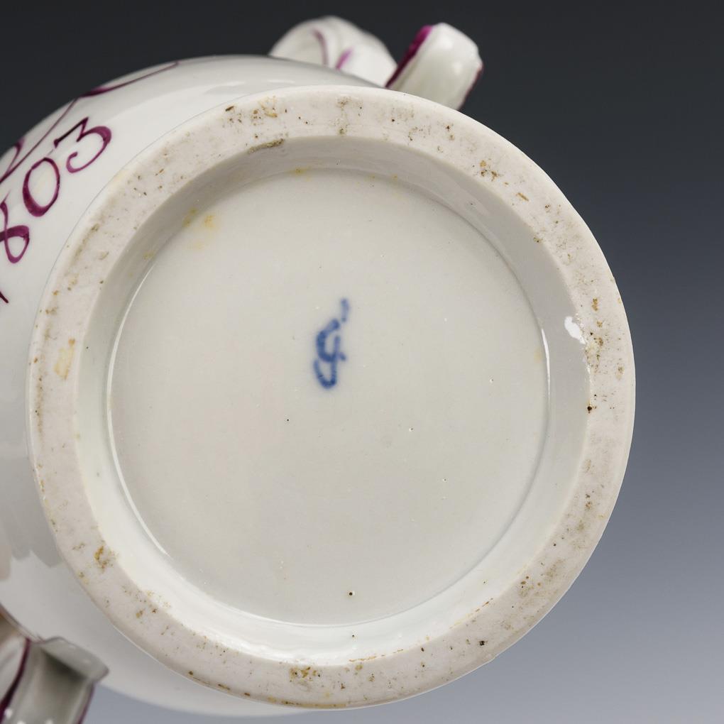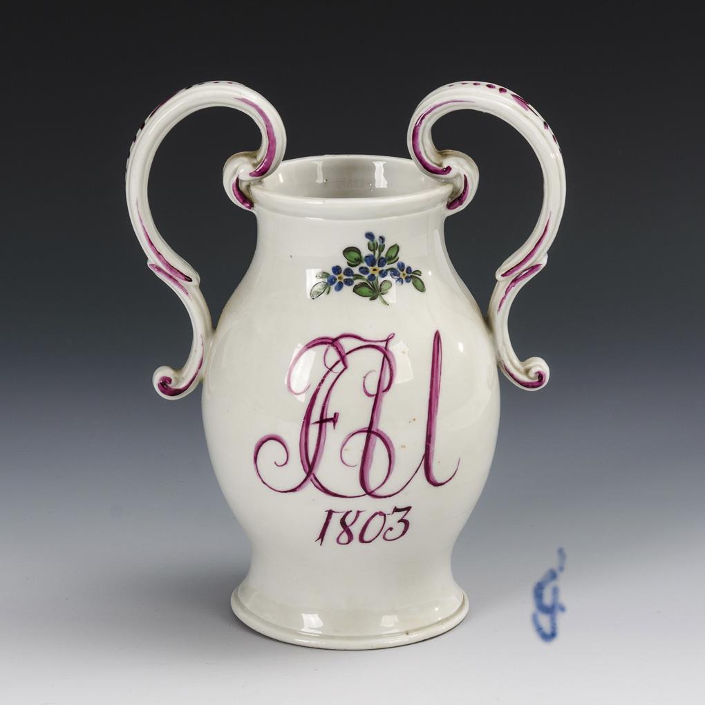 Balusterform mit zwei Rocaillehenkeln. Schauseitig unter einem Vergißmeinnichtstängel das Monogramm "FCU 1803", verso ein Blumenbukett.