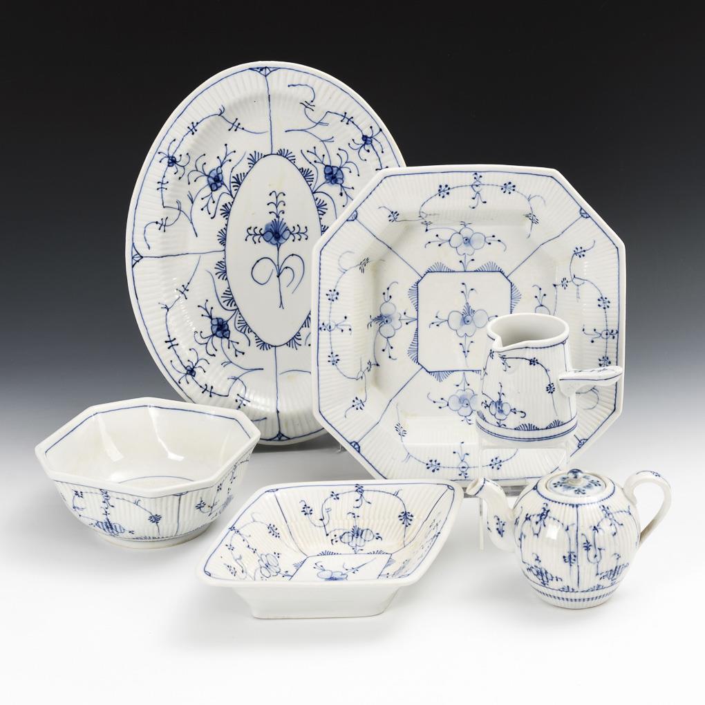 Mit gebrochen gerippten Wandungen. Ovalplatte (L 33,5 cm), 2 verschiedene Quadratschüsseln (27 x 26 cm und 16 x 16 cm), 1 Rautenschale (L 24 cm), 1 Teekännchen mit ergänztem Deckel (H 10 cm) und 1 Milchgießer mit seitlichen Griff (H 9 cm). Kännchendeckel bestoßen, Haarriss im Kännchenhenkel.
