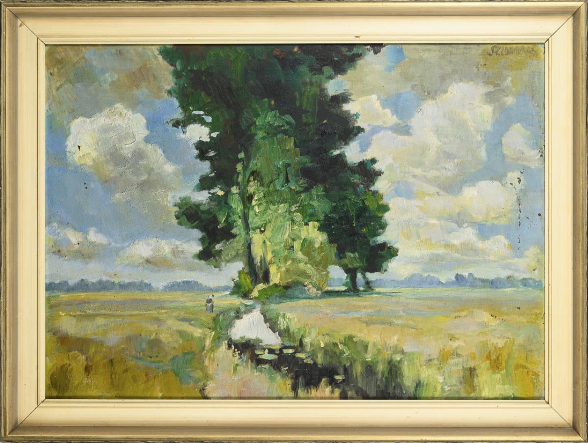 Weite, flache Landschaft mit Bach und hoher Baumgruppe im Sonnenschein. Farbabsplitterungen.