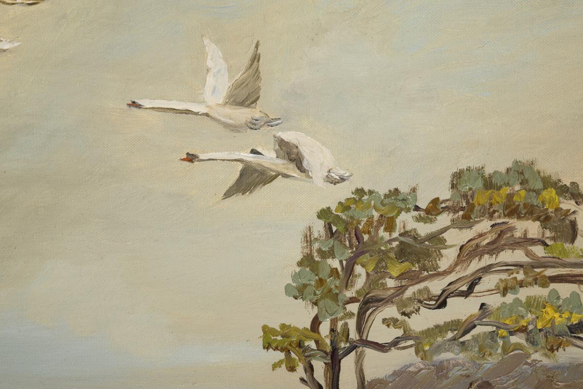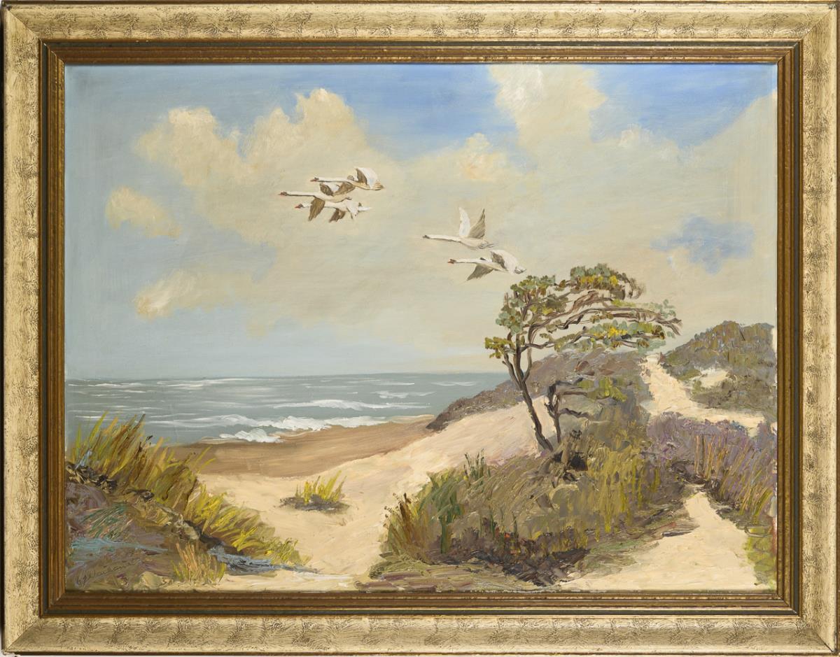 Undeutlich signiert: Schwäne im Flug am Ostseestrand