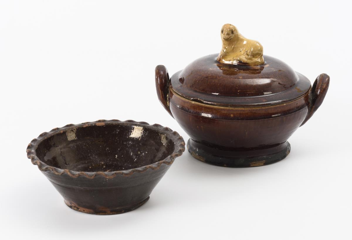 6 Krüge, 1 kleine Henkelbraut, 1 Terrine mit 2 Henkeln und Deckel mit Löwenknauf, 1 Schale mit Wellenrand. Alters- und Gebrauchsspuren, teils mit leichten Defekten.