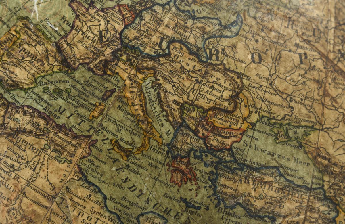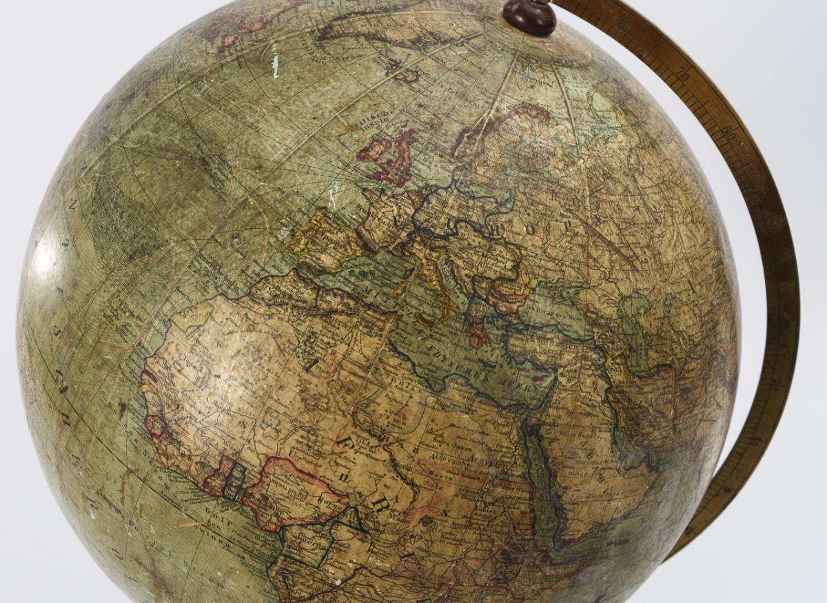 Politischer Globus mit topographischen Darstellungen sowie Schiffslinien. Stärkere Alters-/Gebrauchsspuren.