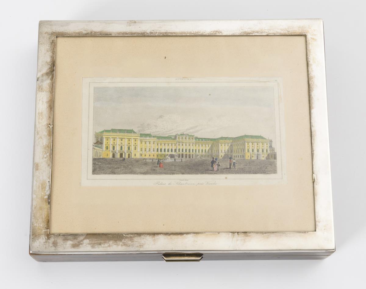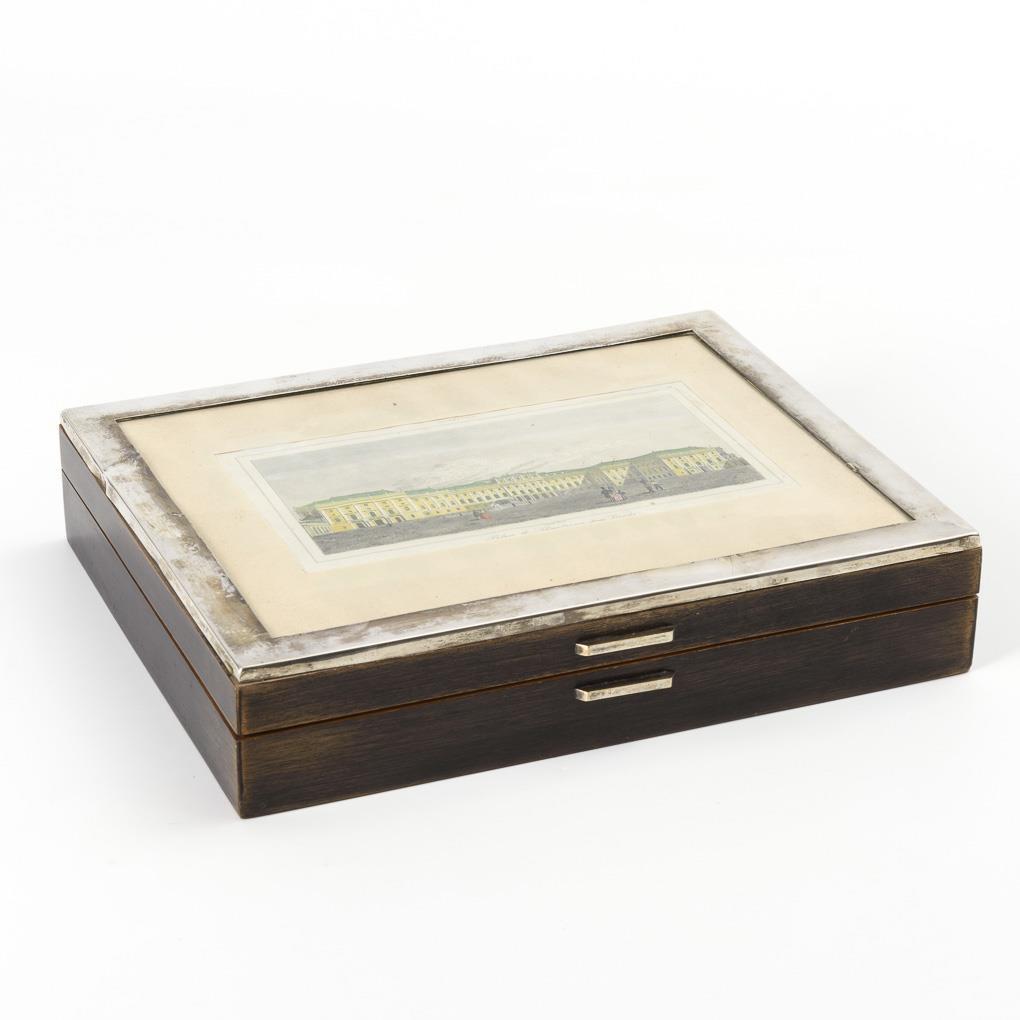 Auf dem Scharnierdeckel im Silberrahmen kolorierte Schlossansicht. Innen 2 verschiebbare Trennwände sowie 2 Savinelli-Luftbefeuchter mit Magnet-Halterungen. Wenige Alters-/Gebrauchsspuren.